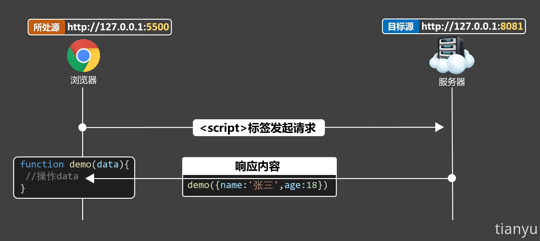 <script>标签,并将其 src 属性设置为包含跨域请求的 URL,同时准备一个回调函数,这个回调函数用于处理返回的数据。 - 服务端接收到请求后,将数据封装在回调函数中并返回。